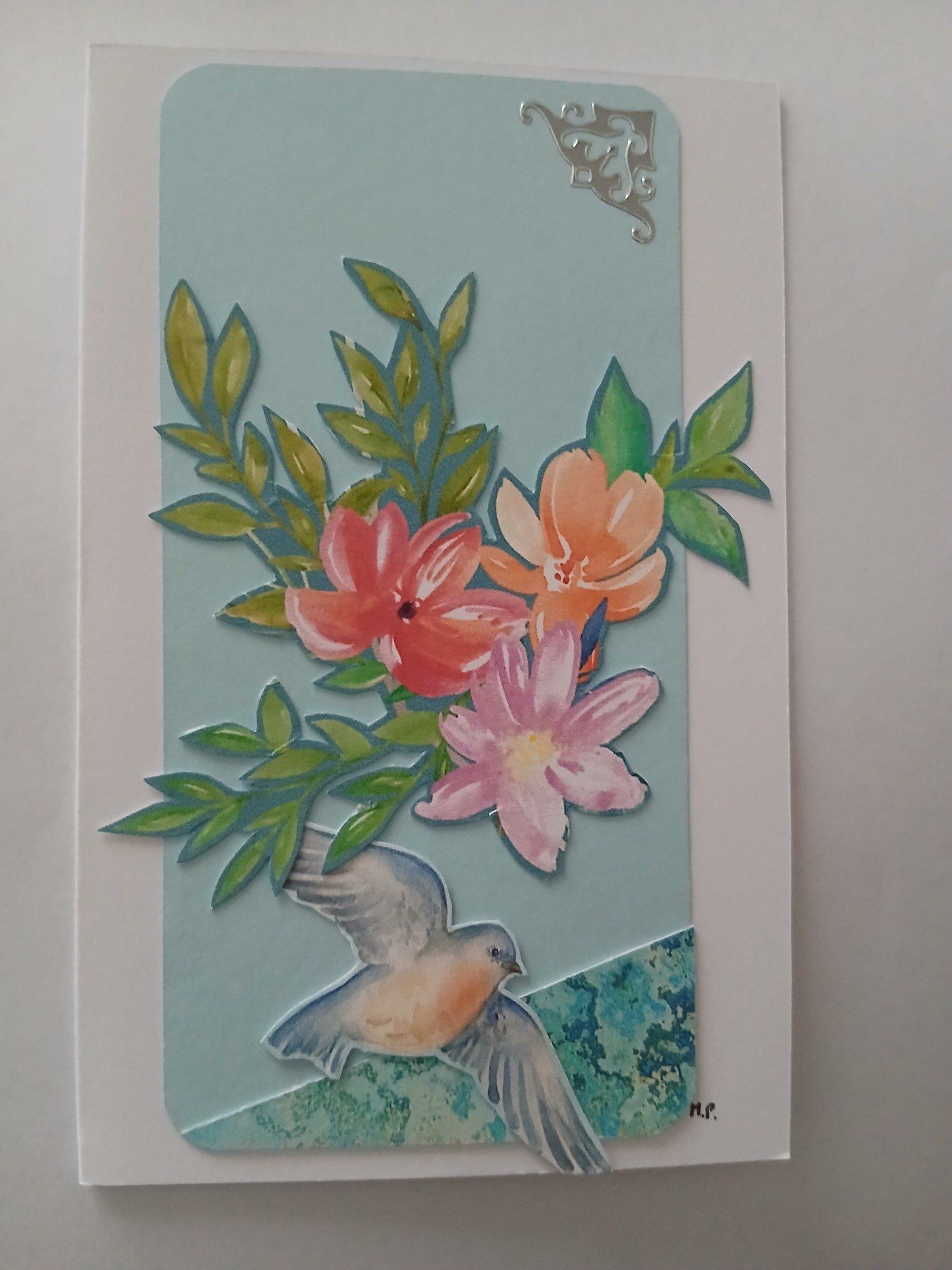 Carte double, illustration fleurs et oiseau, effet
